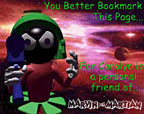 This site includes exclusive Marvin pictures such as Marcia Martian (this was the first site ever to have a picture of Marcia) as well a comprehensive collection of Marvin sound files, including ones from his debut in 1948. You can also view some video clips, and don't forget to check out Marvin's poem too. History - When did Marvin the Martian appear? Marvin the Martian was created by Chuck Jones on 7/24/48 Marvin first met Bugs Bunny in 1948 in "Haredevil Hare". When Marvin first appeared, he was known only as commander-X-23. His original suit was an goldish- brown color then it was changed to the revered color that it is known as today. His voice was also quite different! Marvin turned 51 on July 24, 1999! Marvin's Voice Marvin's voice used to be done by Mel Blanc. Since Mel Blanc passed away in 1989, Marvin's voice has been done by Joe Alaskey (with the exception of the movie Space Jam). Over the years, Mr. Alaskey has worked on Marvin for Lunar Tunes and Marvin the Martian in the 3rd Dimension and he has voiced Marvin for Rhino Records projects, WB Six Flags parks, TV commercials and in-house Warner Brothers projects. Cartoons Featuring Marvin the Martian
